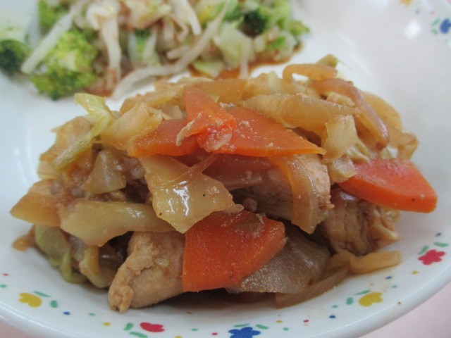 今日の献立は「きしめん・牛乳・カレーきしめんの汁・さつまいものがね・ツナサラダ」です。