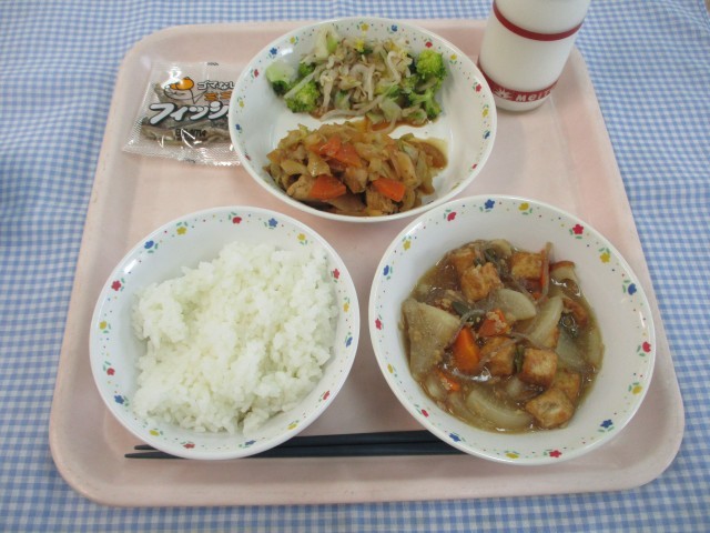 今日の献立は「ごはん・牛乳・ホキのレモンソースかけ・大根のそぼろ煮・福神和え」です。