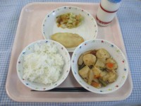 今日の献立は「ごはん・牛乳・チキンナゲット・夏野菜のカレー・白玉ポンチ」です。