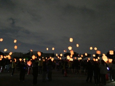 暗くなり、願い事を書いたランタンを上げる時間になりました。風が強くなったので高くは上げられませんでしたが、ランタンの温かい色があちこちに灯る様子は、とてもきれいでした。「子どもたちの心に残る楽しいイベントを」という運営のお言葉どおり、楽しく温かいお祭りでした。