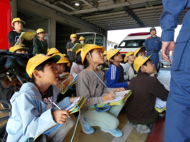 今日は、3年生で海部東部消防署南分署に見学へ行きました。アオキスーパーに続いて、社会科の学習として火事から町を守るために、誰が何をしているのか見に行きました。