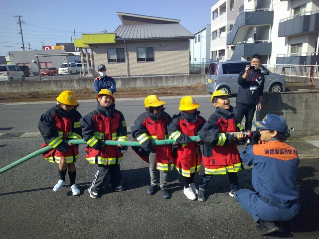 消防署に着くと、化学車やポンプ車、救急車の装備を説明していただいたり、どうしてそういった仕組みになっているのか詳しく教えていただきました。また、仮眠室やトレーニング室など施設の中もたくさん見せていただきました。最後には、防火服を着て放水訓練の体験をしました。