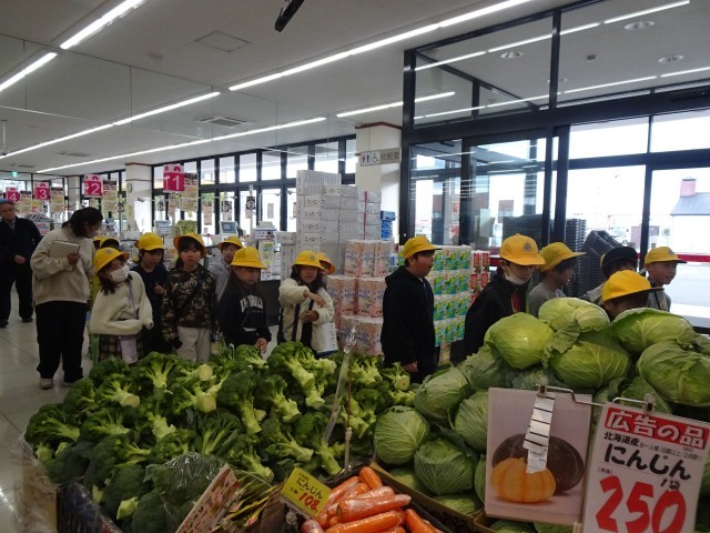 2年生がアオキスーパーに見学に行きました。バックヤードでは、大きなお肉や野菜を切っているところを見て、「お肉ってこんな風につくられているんだね。」「値段のシールってこうやって貼ってるんだ。」とたくさんの気づきがあったようです。「何種類の商品が売っていますか。」や、「最近1番人気だった商品は何ですか。」など子どもたちからの質問にもたくさん答えていただきました。ご家庭でも、スーパー見学でどんなものを見たのかぜひ聞いてみてくださいね。