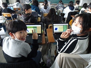 さまざまな問題があるので、一人一人が自分の理解のスピードに合わせて問題を解き進めることができます。中には、前の学年の内容に戻って問題に挑戦している児童もいました。真剣に取り組んでいた5年生ですが、カメラを向けると振り返ってこの表情でした。