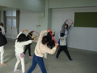 特別支援学級では、ダンスの先生を講師に招いて楽しく体を動かしていました。小さなフラフープを使って体をほぐしたり、ボックスステップを覚えたり。説明の言葉や方法がとても分かりやすく、子どもたちも目標をクリアすることができました。最後は担任の先生たちも一緒に、元気いっぱい踊りました。