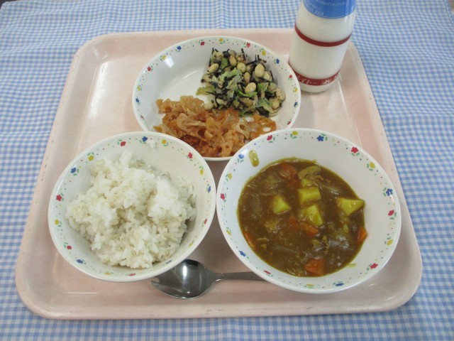 今日の献立は「麦ごはん・牛乳・カレー・れんこんチップス・ひじきとキャベツのサラダ」です。