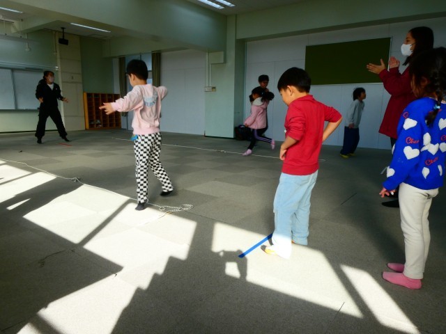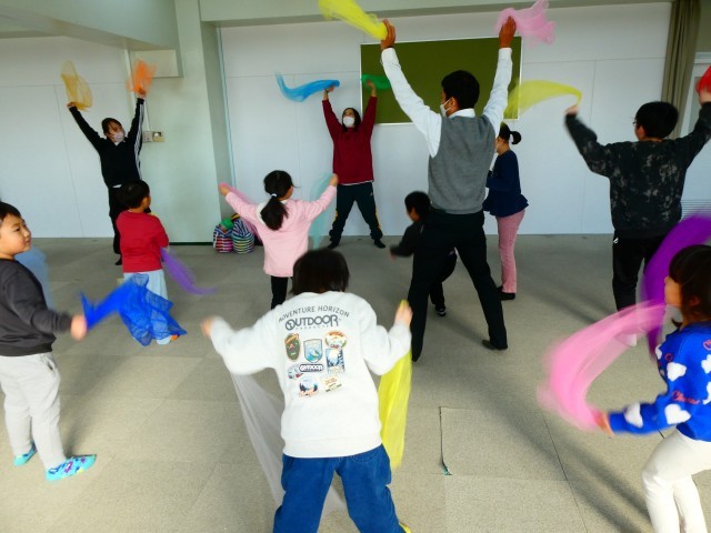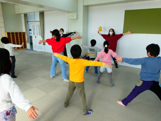 特別支援学級では、先週に続き、ダンスの先生を講師に招いて授業を行っていただきました。思わず体を動かしたくなるような音楽を流しながら、ロープを使って足のステップを練習したり、絵カードに合わせて動きを合わせたりして、リズムに合わせて楽しく活動しました。最後に1曲、カラフルな布を両手に持って踊ったのですが、布があるだけで、体を大きく動かしたくなったり全体が華やかにみえたりして、心が弾むような気持ちになりました。音楽の良さを感じながら、体の動きやコミュニケーションの取り方を学ぶことができる有意義な時間となりました。講師の先生方、2日間ありがとうございました!