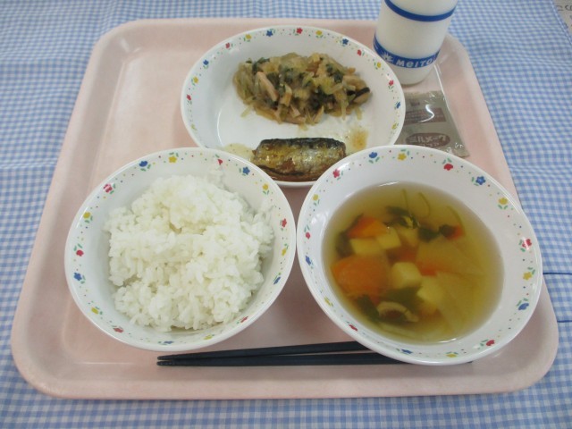 今日の献立は「ごはん・牛乳・いわしの梅煮・★きのこたっぷりチャプチェ・豆腐のすまし汁・ココア牛乳の素」です。