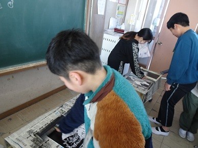 5年生は図工で彫刻刀を使っています。版を掘り終わり、いよいよ刷りの作業に入りました。和紙の両端を持った2人が、インクをつけた板にそっと紙を下ろします。そのあとは「ばれん」で紙をしっかりこすり、インクを写し取ります。「もういいかなあ」と紙の縁をめくって確認。わくわくする一瞬です。「おお」と周りの歓声も上がりました。