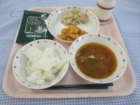 今日の献立は、カラフルピラフ、牛乳、オムレツ、イタリアンサラダ、かぶのクリームスープです。ピラフにオムレツをのせると、「オムライスみたいでおいしそう!」!と言ってくれている子がいました。