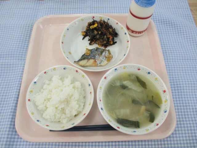 今日の献立は「ごはん・牛乳・さわらの香味焼き・ひじきの炒め煮・鶏団子汁」です。