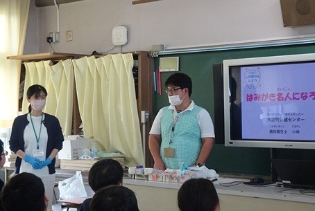 口の中のばい菌が動く動画に驚いた子どもたち。真面目な顔で、なぜ歯磨きが大事なのかのお話を聞いていました。