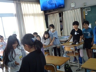 のぞいた教室では、グループの6年生がゲームの説明をしていました。4月は担当の先生のフォローが入っていたグループも、ほぼ児童任せで進行している様子でした。15分に満たない短い時間の中で、始めのあいさつ、説明、確認、ゲーム、終わりのあいさつまで行うのはなかなか難しいことです。実際、絵しりとりのグループでは、順番が回ってこなかった児童もいました。そのグループでは、進行の6年生が最後のあいさつで「時間がなくてできなかった子もいて、ごめんね」とみんなに伝えていました。不満の声は誰からも上がりませんでした。子どもたちそれぞれが相手のことを思いやる姿でした。