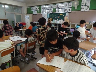 3年生の写真は先週金曜日のものです。学級同士で「宿題大交流会」を開催していました。「先生、私のノート見て」と開いてくれたページには、漢字の書き取りだけでなく、「なぜ間違えたか」「書き取りをした感想」まで書き込まれており、考えていることがよく伝わってきました。友達のノートに刺激をもらった児童もいるようでした。