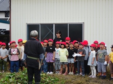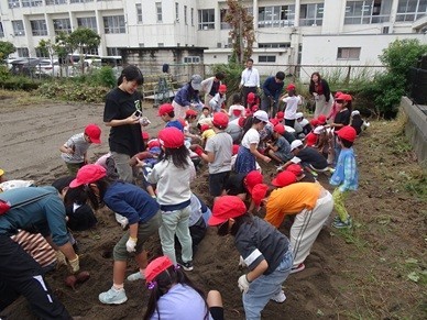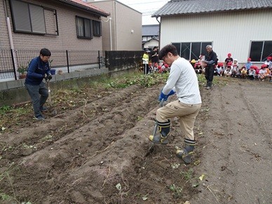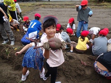 JAや農業振興会の方が準備を整えてくださり、子どもたちの準備も万端。掘り始めると、「きゃあ!(大きなイモが掘れた)」「うわあ!(幼虫が出てきた)」と大盛り上がりでした。子どもたちの顔ぐらい大きなものもありました。「こんなにつながってる」「ごぼうみたいな形のが出てきた」「すぐ食べても甘くないんだって」と、たくさんの気づきもあるようでした。
