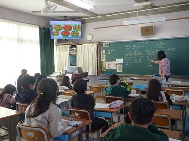 4年生の教室では、社会科で宝暦治水について学んでいました。現在のような重機もない時代、冬場に冷たい水の中でどのように川を堰き止めたのか、担任の先生の話をじっと聞いていた子どもたち。工事で命を落とした人がたくさんいることを知ると、驚きの声が上がりました。「先生、『杭』って何ですか?」と質問の声があがるのも、真剣に話を聞いているからこそです。