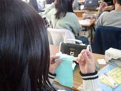 家庭科で裁縫をしていたのは5年生の学級でした。なみ縫い、折り返し縫い、ボタン付け、玉どめなど、細い針や糸に苦戦している子もいます。早くできた友達がアドバイザーになって困っている子に助言をしていました。普段からやっているのか、器用にイニシャルなどを刺繍している子もいました。集中している時間はあっという間です。「時間が足りない!」と声があがりました。