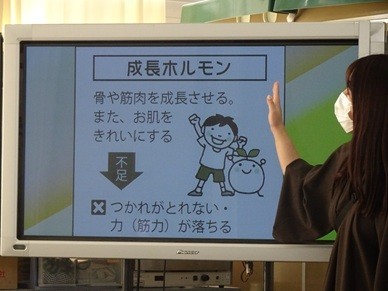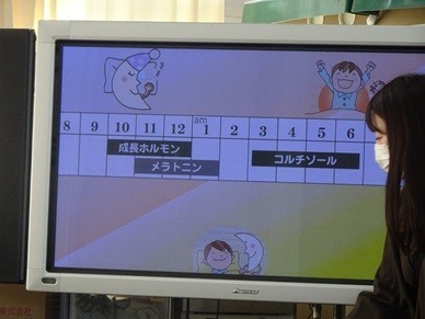 子どもたちの中には、遅い時間に眠ったり、睡眠時間が短かったりする子が少なくありません。養護教諭の先生からは、十分な睡眠時間がなぜ必要なのかについて、具体的なお話がありました。睡眠時間が少ない自覚がなかった子も、体の成長に関わる大切なホルモンが分泌される時間を知りました。