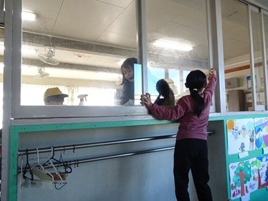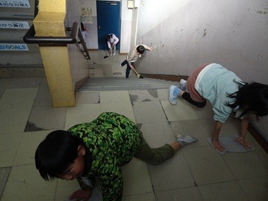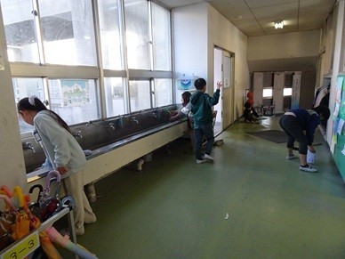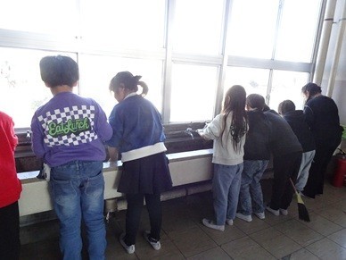 廊下の窓や、傘立ての隅。ほこりや砂がたまっているところを小さなほうきで丁寧に掃いたり、水拭きをしたり。廊下を歩いていると、「先生、こここんなにきれいになったの、見て!」「先生、水拭きがんばったよ」と、成果を見せてくれました。暖かい日ではありましたが、水はとても冷たいのです。(「大掃除2」に続く)
