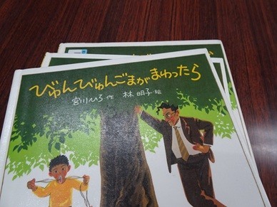 今月、読み語りサークルたんぽぽさんが2年生に紹介してくださった本は、「びゅんびゅんごまがまわったら」でした。1982年に初版が発行されてから、長く読み継がれてきた人気の絵本です。当時、この本をきっかけに「びゅんびゅんごま(ぶんぶんごまとも言うそうです)」に夢中になった小学生たちがたくさんいました。私も当時を懐かしく思い出し、作ったこまを2年生に差し入れました。