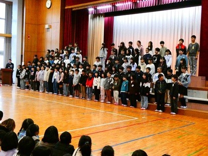 一生懸命に歌う表情はもちろんですが、歌い終わった後の満足気な笑顔や、他学年の合唱に身を乗り出して聴き入る姿に、子どもたちの合唱にかける思いを見ることができました。