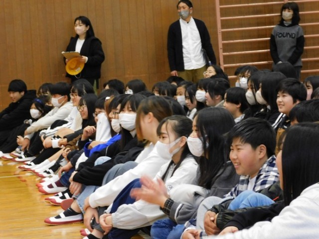 体育館入口のカーテンをくぐった子どもたちは、いつもの体育館に大きなセットが作ってあることにびっくり。そのあとは、劇団の皆さんが見せてくれる不思議な世界の中で、大笑いしたり、一緒に怒ったり。最後には主人公を応援する気持ちで心が一つになりました。