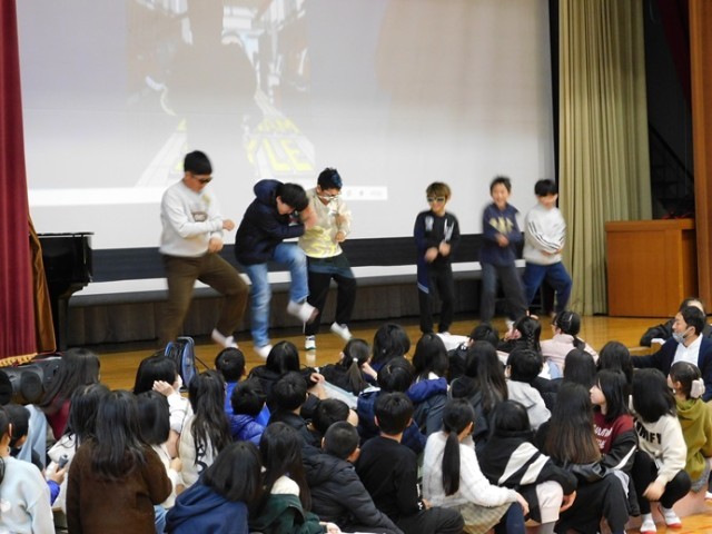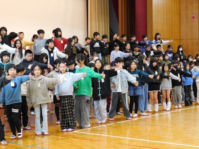 2年生のカリスマックスは圧巻の迫力。通学団やくすのこ大縄大会の寸劇で、6年生との思い出を振り返りました。続く1年生は、6年生に学習クイズを出しました。国語のくじらぐもや、音楽で歌った歌のタイトル。声を合わせたかわいい歌声に、6年生も笑顔になりました。3年生からは「6年生に愛を伝えよう!」と元気なダンスのプレゼント。サビの部分では、3年生以外のたくさんの児童が一緒に踊る姿もありました。学校で一番人数の多い4年生は、ぴたりと息のあった演技で会場を盛り上げました。「いいじゃん!」の言葉にのせて、6年生にエールを送りました。最後をしめたのは5年生。6年間を振り返り、学年目標や校長先生、当時流行ったダンスなど、大きな笑いで会場を沸かせました。