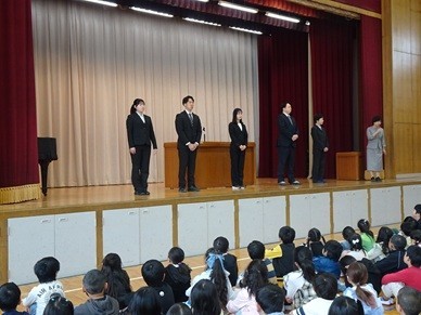 着任式では新しくみえた先生方の自己紹介を聞きました。そのあと校長先生から担任・職員紹介がありました。子どもたちにとっても先生にとっても、どきどきする瞬間です。最後は「よろしくお願いします」の気持ちをこめて、大きな拍手をしました。
