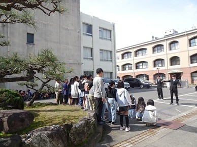 花のアーチをくぐった6年生。朝礼では一番後ろに整列しますが、主役の今日は一番前の特等席で出し物を観ました。