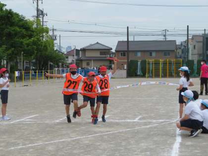 各クラスの先頭が勢いよくスタートしました。棒を4人でもって、走ってコーンを回ったり、待っている子たちの足元をくぐらせたりして最後まで競技を楽しむ姿が素敵でした。 -