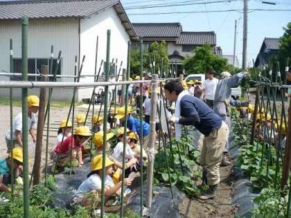 5月に植えた夏野菜が大きく育ち、野菜が地面につかないように支柱立てをしました。