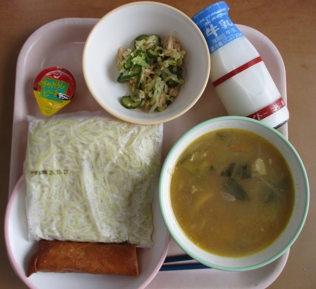今日の給食(10月21日(火)) 公開日 2025/10/22 更新日 2025/10/21 給食 中華めん、牛乳、豚骨ラーメン、春巻き、中華サラダ、一口ピーチゼリー【豚骨ラーメン】 今日の豚骨ラーメンには、にんじん・たまねぎ・もやし・チンゲンサイなどの野菜がたくさん入っています。スープは、豚骨白湯を入れ、ことこと煮込むことで豚骨ラーメンらしい色とまろやかさを出しています。 いいね(0)