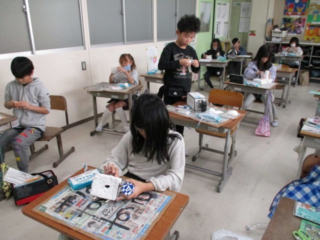 図画工作で「空きようきのへんしん」に取り組んでいます。