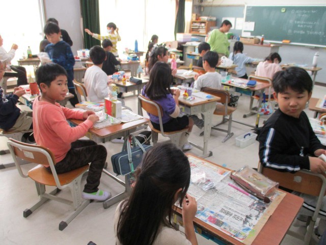 容器を組み立てて、紙粘土で飾り付けをします。子どもたちは「使える作品」に仕上がるよう、一生懸命にがんばっています!