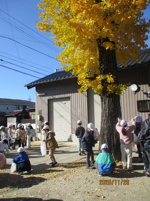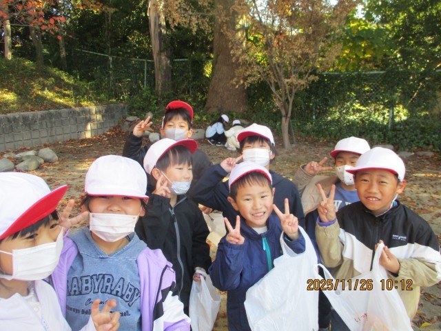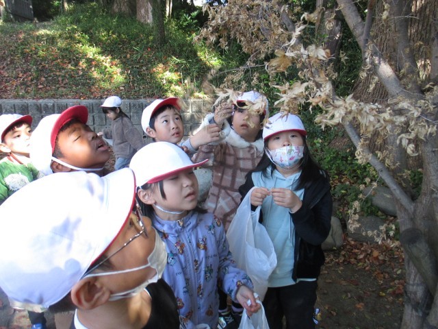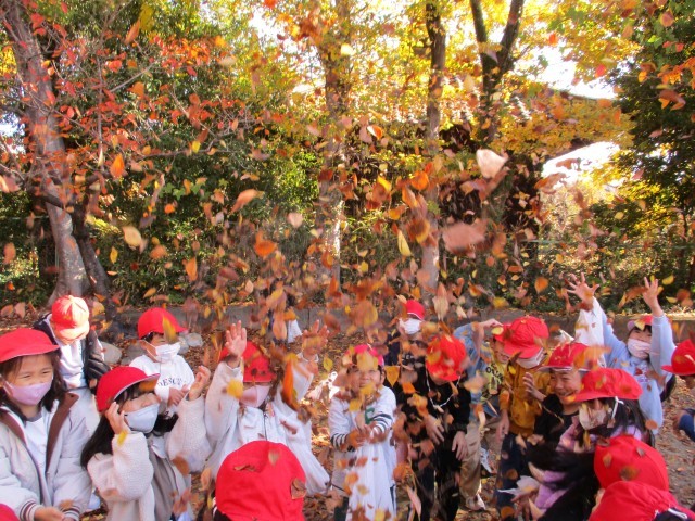 11月26日水曜日、馬島神社へ秋を探しに行きました。秋のおもちゃ作りに使う落ち葉やどんぐりがたくさん落ちていました。子どもたちは、赤や黄色に色づいたサクラやイチョウの葉っぱを見て、季節の変化を肌で感じ取ることができました。ご同行いただきましたはるボラの皆様、ありがとうございました。