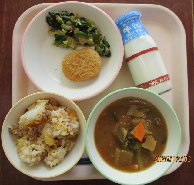 今日の給食(12月3日(水)) 公開日 2025/12/05 更新日 2025/12/03 給食 キムタクご飯、牛乳、里芋コロッケ、土佐和え、冬野菜のみそ汁【キムタクご飯】 キムタクご飯は、キムチとたくあんが入った混ぜご飯です。長野県の学校給食からうまれたメニューで、長野県は漬物が特産品で「子どもたちにおいしく漬物を食べてもらいたい」という思うから作られるようになりました。 いいね(0)