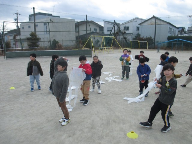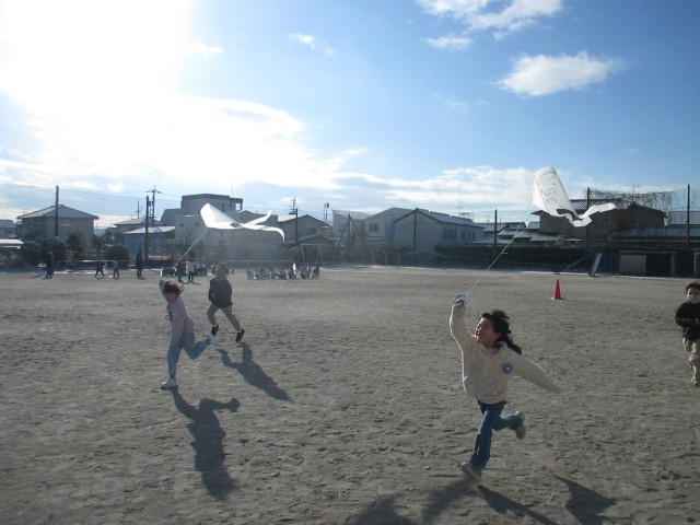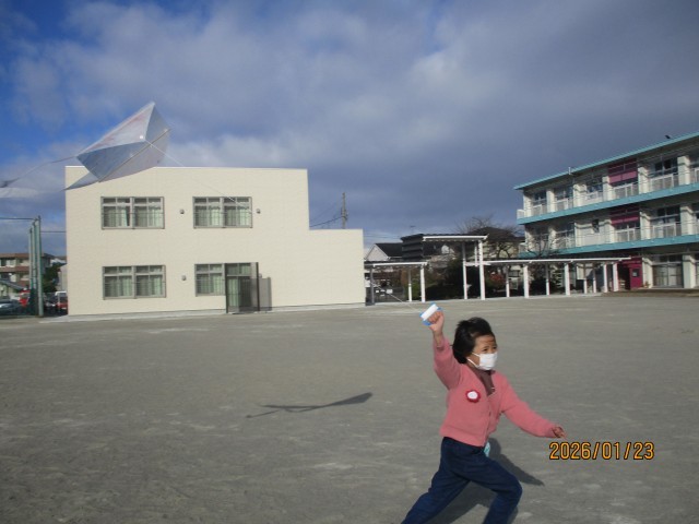 1月23日(金)、みんなで凧揚げを行いました。厳しい寒さの中ではありましたが、寒さに負けず、元気いっぱいに凧を揚げることができました。空高く舞い上がる凧に、子どもたちからも歓声が上がっていました。