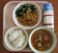 ご飯、牛乳、たことごぼうと大豆の土佐酢漬け、福神和え、トマトのふんわり汁、味付けのり