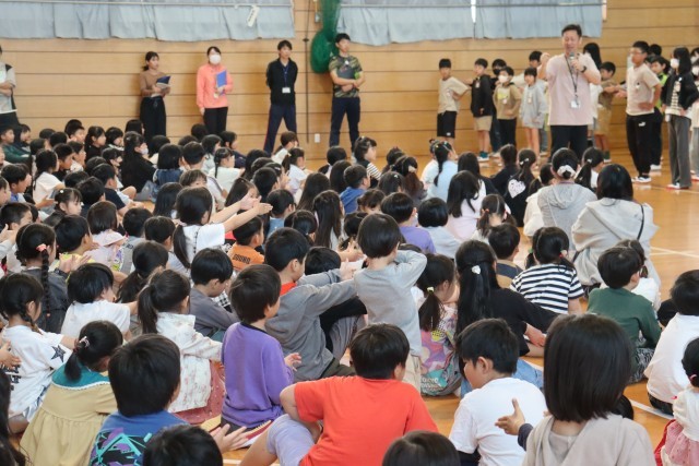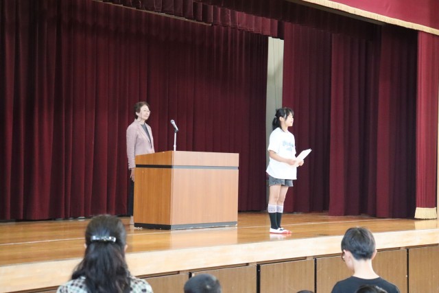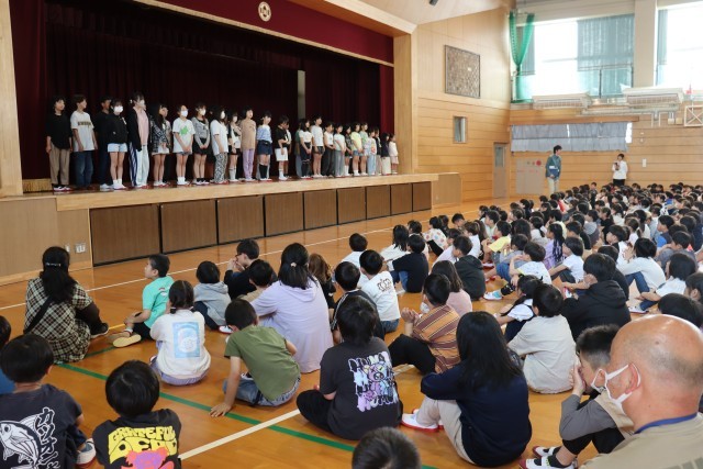 「朝礼では、最高学年が初めに体育館に入ります。そして、話を聞く雰囲気をつくってくれています。そのおかげで、他学年も静かな雰囲気をつくることができています。6年生もすばらしいですが、その姿を見てすぐに行動できる下級生のみなさんもすばらしいです。」とあたたかいお話がありました。