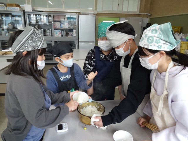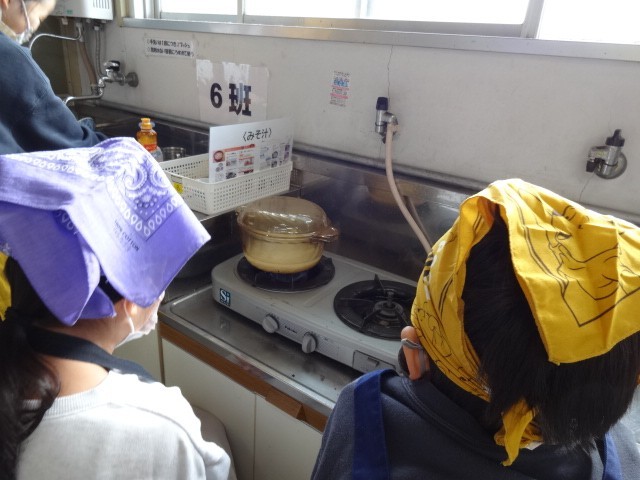 5年生は家庭科「食べて元気!ご飯とみそ汁」の学習で、調理実習に挑戦しています。