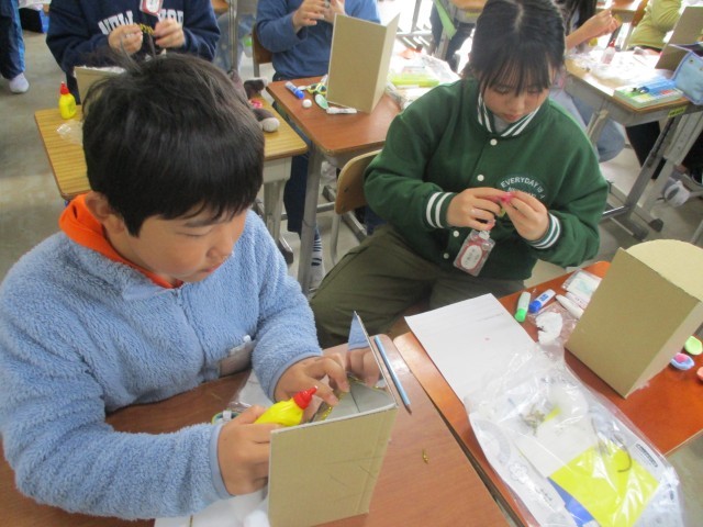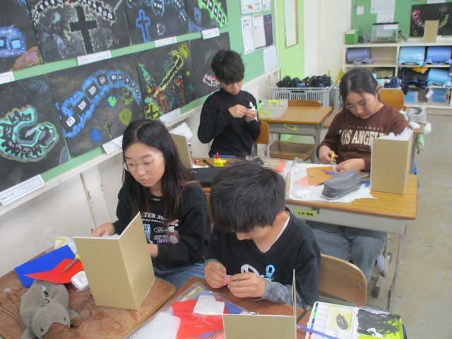 5年生はミラーの仕組みをいかしたミラクルミラーワールドという作品を作っています。ミラーに写す角度や模様、色の使い方など工夫をして作品に取り組んでいます。
