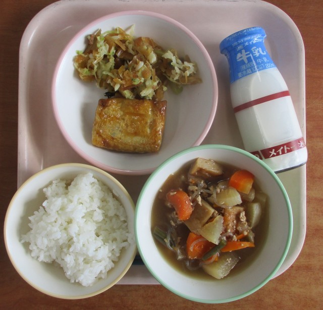 ご飯、牛乳、いわしの梅煮、揚げじゃがいものきんぴら、つくね汁
