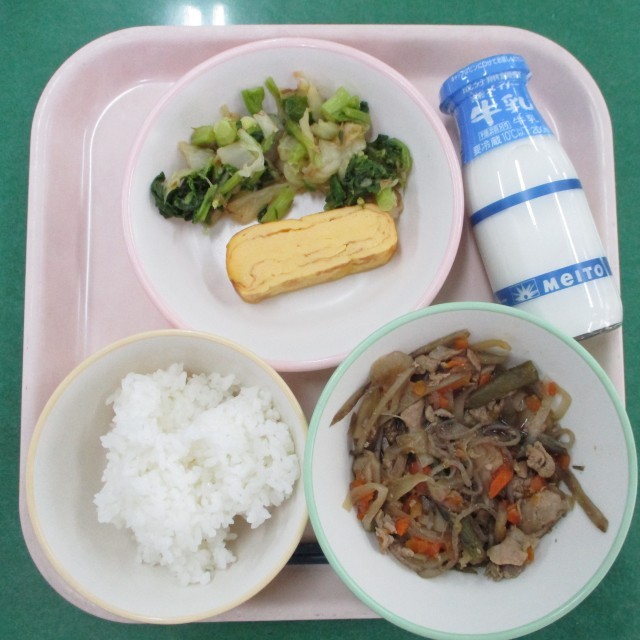 ご飯、牛乳、厚焼き卵、菜の花のお浸し、豚丼