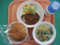 ご飯 牛乳 厚揚げの肉味噌かけ ひじきとベーコンの炒め煮 かきたま汁