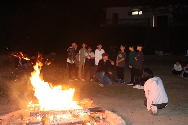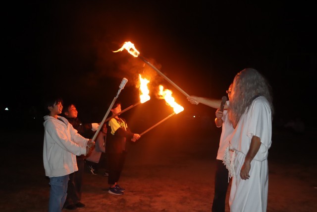 5年生 野外教室 キャンプファイヤー 公開日 2025/09/27 更新日 2025/09/27 5年生 自然の家で夕食を食べたあと、キャンプファイヤーを行いました。火の神から火をいただきました。エールマスターに様々なスタンツをしてもらい、大いに盛り上がりました。最後は、学年スタンツ「マイムマイム」を全力で踊りました♪ いいね(2)