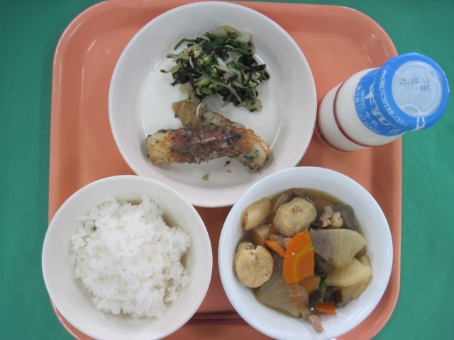 10/1 今日の献立 公開日 2025/10/01 更新日 2025/10/01 今日の献立 ご飯 牛乳 ちくわの赤しそ揚げ 磯香和え 関東煮 関東煮には、鶏肉・大根・人参・はんぺん・がんもどき・こんにゃく・さやいんげん・昆布を入れ、具沢山に仕上げました。つゆが染みこんだ大根はやわらかく、子どもたちにも好評でした。 いいね(0)
