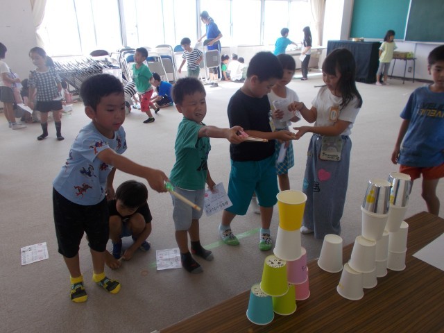 1年生は大喜びで、ゴムでっぽうや、空き箱めいろなどの様々なおもちゃを楽しみました。