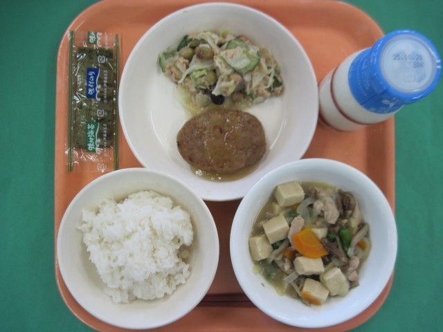 10/9 今日の献立 公開日 2025/10/09 更新日 2025/10/09 今日の献立 ご飯 牛乳 おろしハンバーグ まめまめサラダ 高野豆腐のうま煮 味付け海苔 まめまめサラダには、大豆・青エンドウ豆・赤インゲン豆・ひよこ豆が入っていました。子どもたちは、色や形の違いを見ながら食べていました。豆類はたんぱく質や食物繊維を豊富に含むものが多くあります。苦手な子も多い食品ですが、チャレンジしている子がたくさん見られました。 いいね(0)