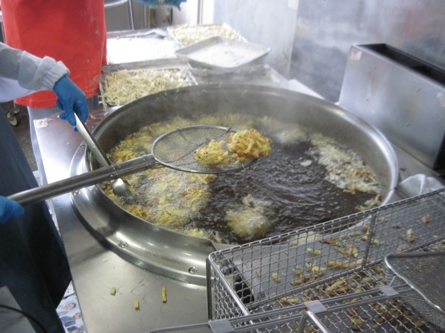 さつまいもがねは夏に募集した「わが家の味を給食に!」の優秀作品です。鹿児島の郷土料理の「がね」を祖父母の家で食べた際に好きになり、帰ってきてからも作っていることから応募してくれました。「がね」は方言で「かに」を意味し、さつまいもやたまねぎなどを小麦粉を溶いたものを絡ませて揚げた形がかにのように見えることからこの名前がついたそうです。給食室で一つ一つまとめながらフライヤーに入れ、崩れないように丁寧に揚げました。