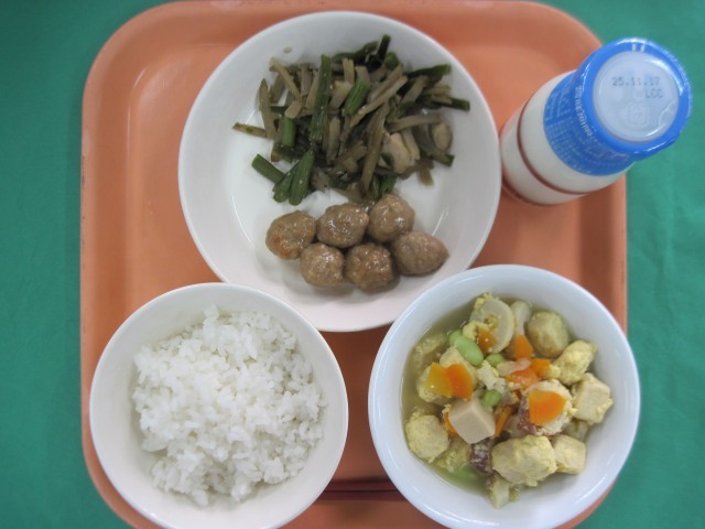 ご飯 牛乳 肉団子のおろしソース 茎わかめ入りきんぴら 高野豆腐の卵とじ